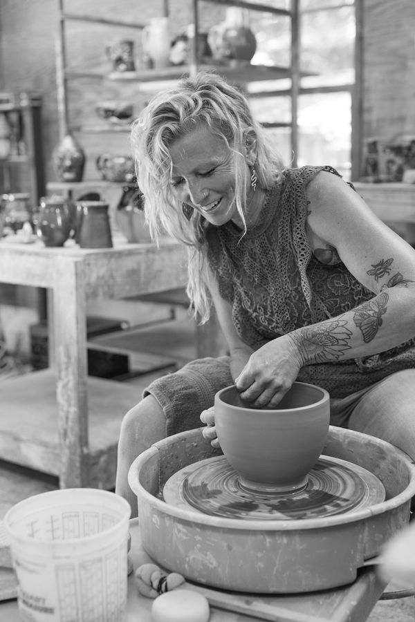 I specialize in making meticulously formed and uniquely adorned, wheel thrown functional pottery. As a practice, I lean into the challenging dialogue of working with clay, finding my own center at the wheel while the rest of my world keeps spinning. My artistic values guide the work by engaging with every possible step of the process, pushing my knowledge of materials further each time. Flower gardens, coastal landscape paintings and tattoos influence my thoughtful surface designs, informed by decades of education, experience and occupation. Incorporating organic designs as well as unique experiences into my pottery, I carefully choose colors that evoke emotion and patterns that denote special meaning to design a strong visual composition over a well-formed pot. The finished outcome is dependent on my working understanding of material versatility in a variety of kiln atmospheres.